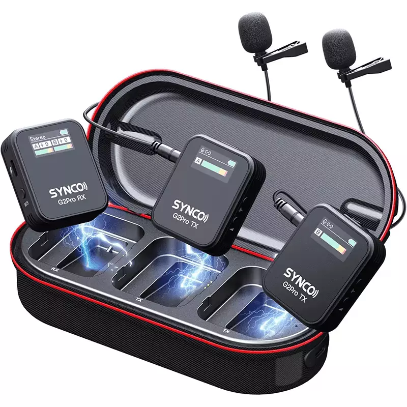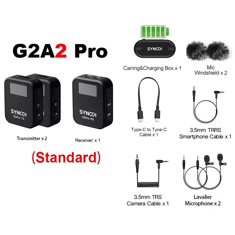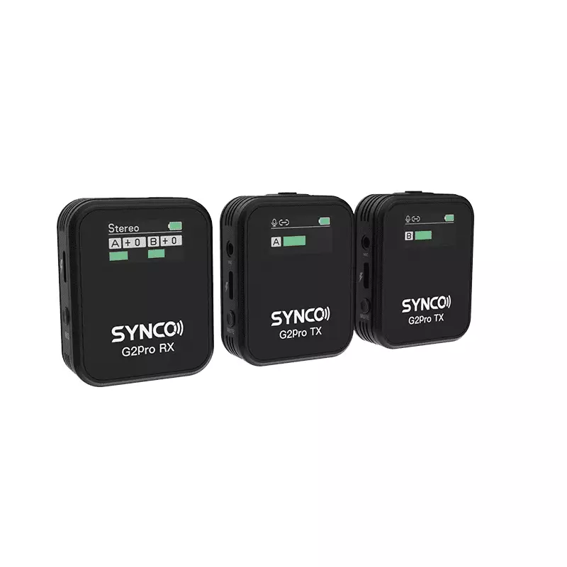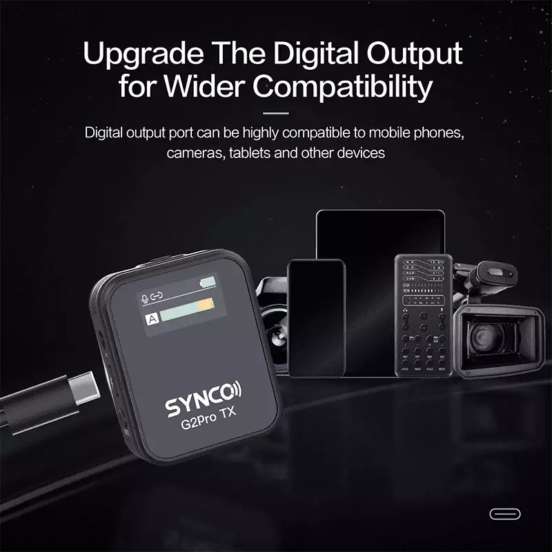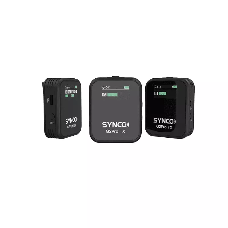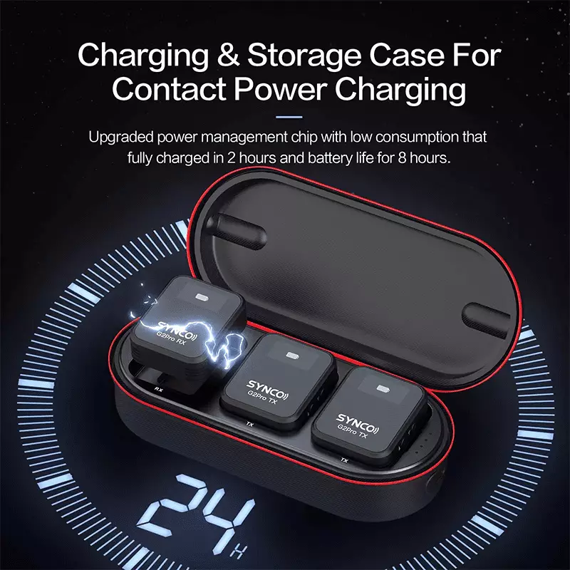 The SYNCO G2 Pro is a long range wireless microphone at 656ft/200m (LOS). It owns the same compact form factor and features as the original G2 and comes with innovative features including one-click noise reduction, gain control on both TX and RX, safety channel mode, universal digital Type-C output, digital audio monitoring, and much more. It is universally compatible with cameras, smartphones, computers, loudspeakers, etc. With the supplied charging box, the G2 Pro offers 24 hours of recording time in total for video creation, interviewing, live streaming, etc.