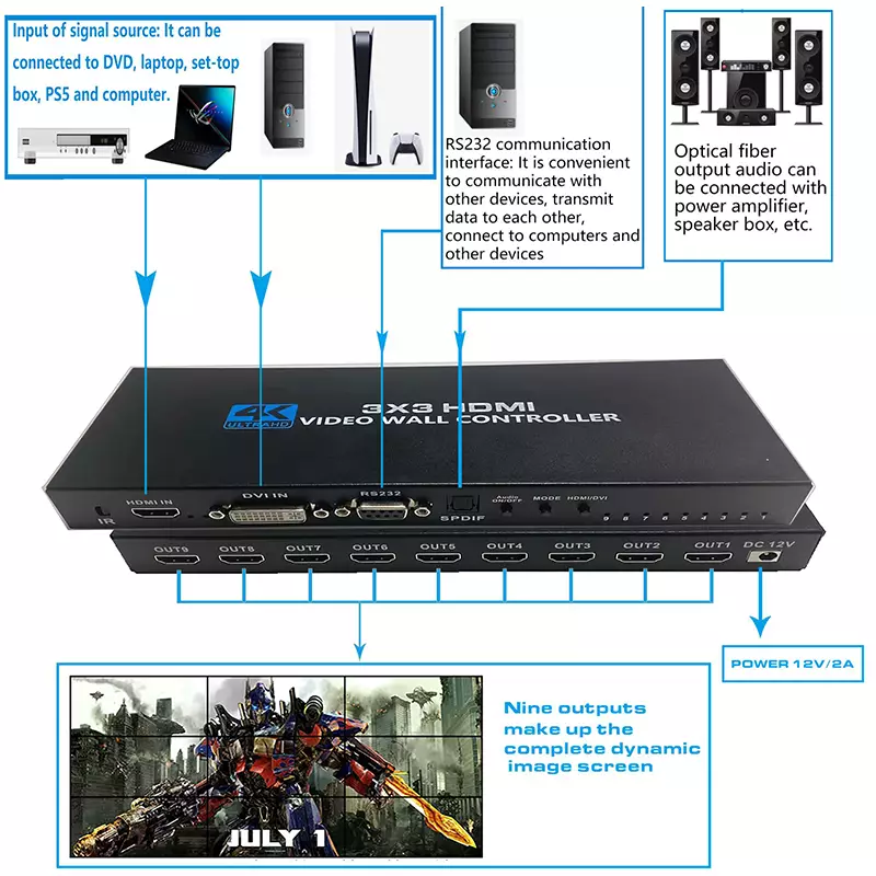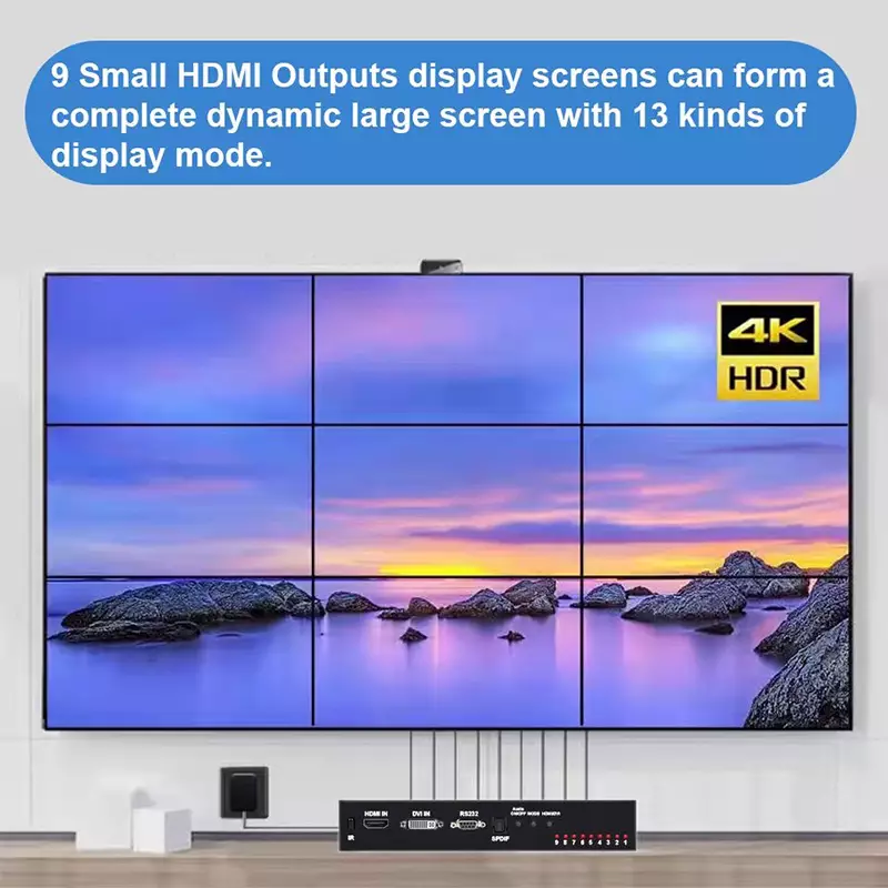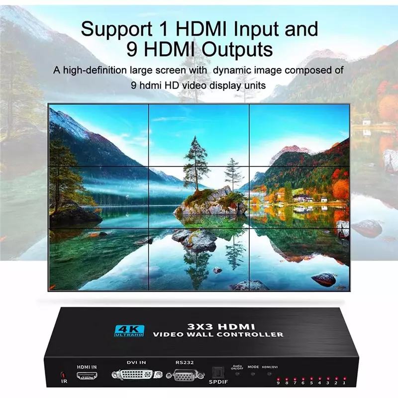 The 4K 3X3 video wall controller, support 1-way HDMl or DVI input and 9 HDMl output,function is to divide a complete HDMl, DVI HD image singal into 9 blocks and assign to 9 video display unit (such as rear projection unit, LCD TV etc.).