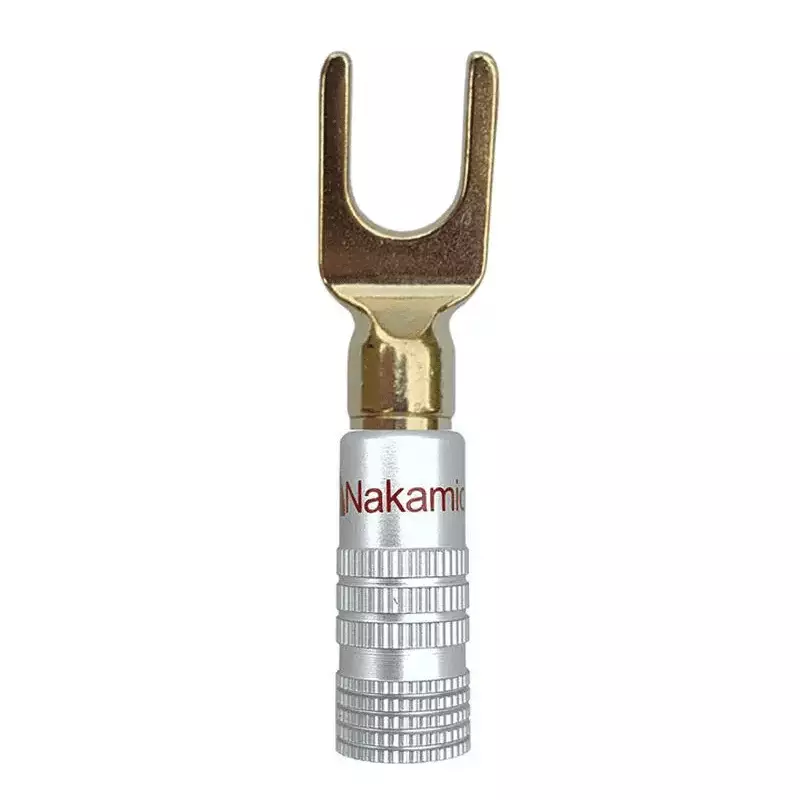 This pair of Gold Plated Nakamichi U Spade Terminal Speaker cable connectors are designed to offer exceptional, yet affordable performance by ensuring ‘optimal contacts’ to both your amplifier and speakers. The actual contact is made of pure copper with a 24ct Gold plating while the outer shell ‘protector cover’ is made of aluminium with a pure copper insert. Each connector has dual offset screw contact points located at opposite ends.