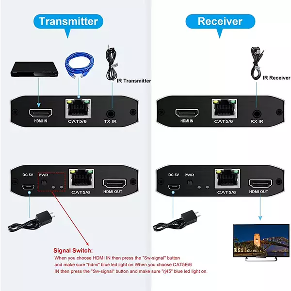 - Signal transmission: By using single cat-5e or cat-6(recommended) cable instead of HDMI cable, it can extend the distance up to 60m between TX and RX