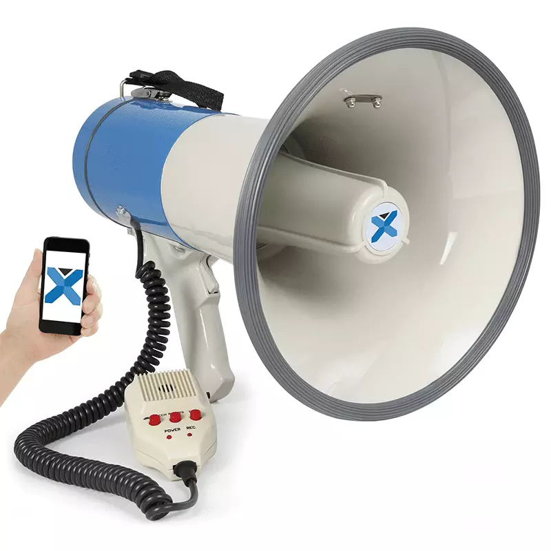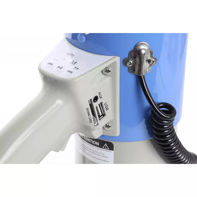 Powerful megaphone with built-in 55W amplifier and detachable anti-howl microphone with coiled lead. Features a BT receiver for audio streaming, USB/SD slots for MP3 playing, a record function, volume control and an adjustable shoulder strap. Distance 0.7 – 1.0km depending on operating conditions.