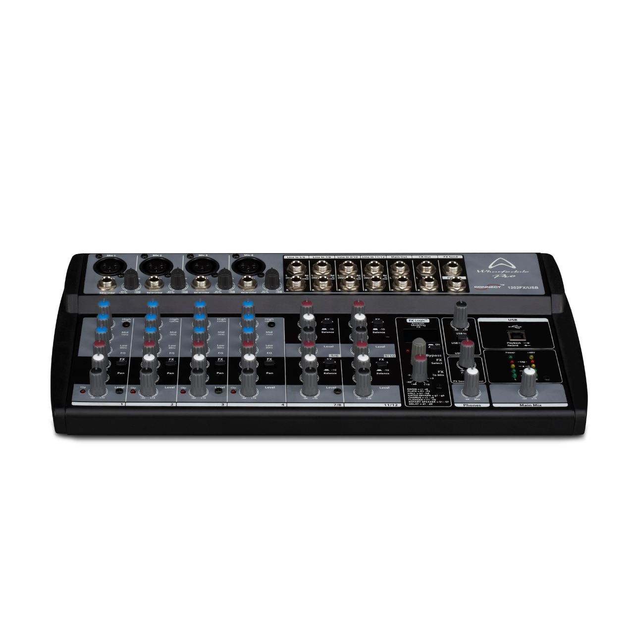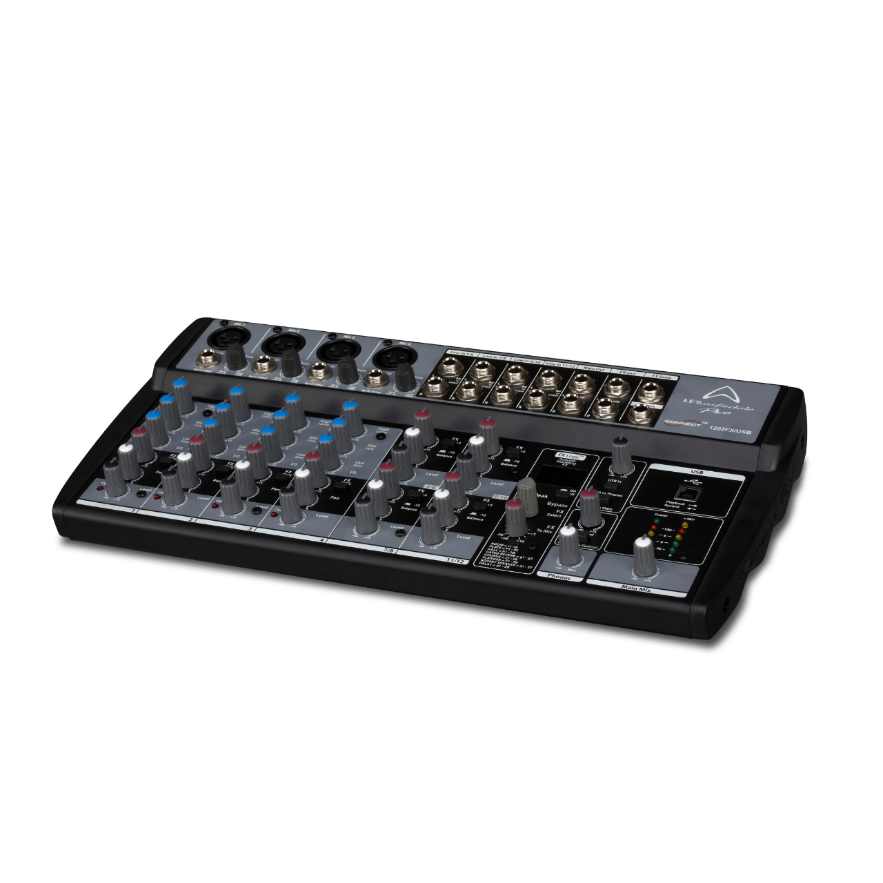 The Wharfedale Pro Connect 1202FX/USB is a compact mixing desk with massive capabilities. If you need a portable mixing desk and you do not want to sacrifice space for connections we have managed to condense ample inputs, outputs, digital FX, and a USB audio interface into a small footprint mixer which is at home in the studio as it is the road.